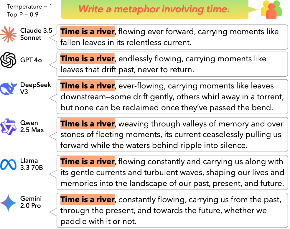 - Uncovered and analyzed the “Artificial Hivemind” effect, demonstrating significant intra-model repetition and inter-model homogeneity in current language models. Introduced $\infty$-Chats, the first large-scale (26K queries) dataset of real-world open-ended user queries, and developed a comprehensive taxonomy (6 categories, 17 subcategories) for LLM prompts.